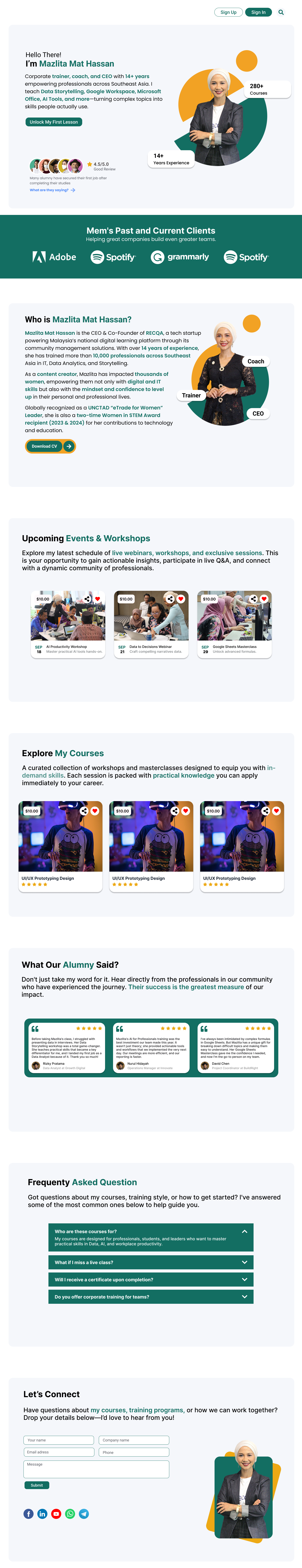 Creating a premium Personal Learning Platform for Mem Maz. This design focuses on conversion and credibility, presenting the personal training and courses of an experienced coach in a professional and engaging layout. The User Experience is crafted to guide visitors seamlessly from the landing page to course enrollment, successfully boosting sales and mentor engagement.